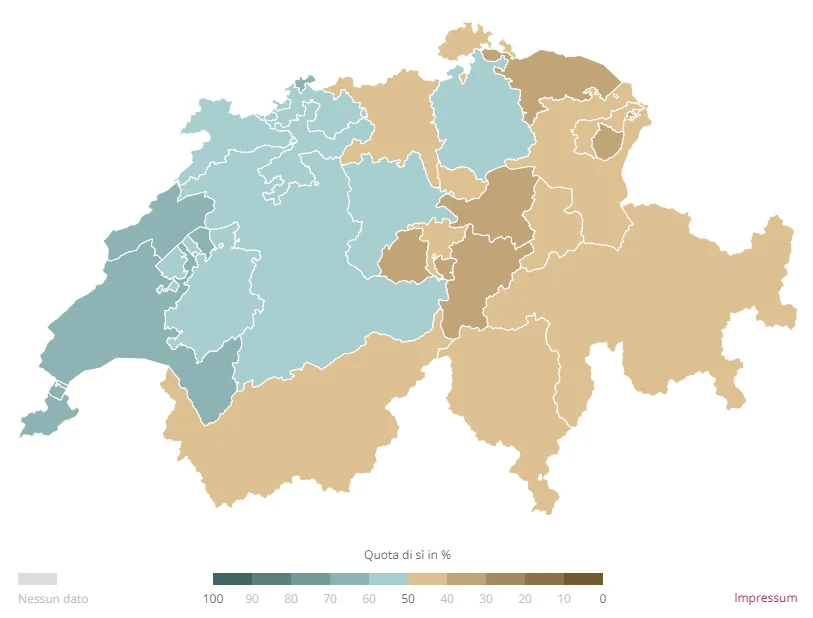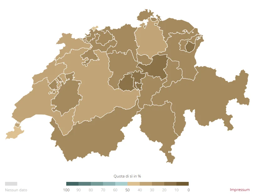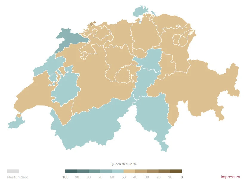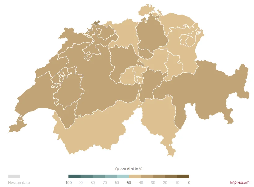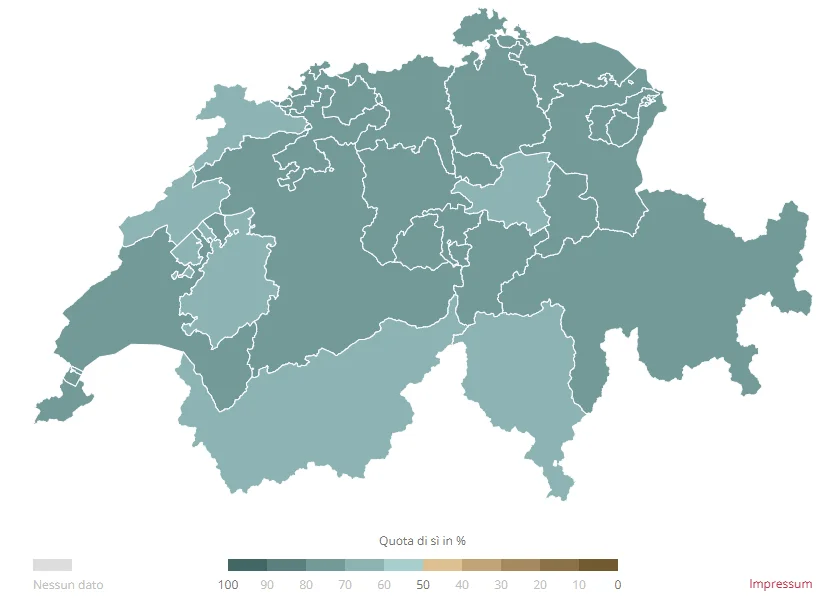 Il controprogetto è stato approvato in tutti i Cantoni, con percentuali comprese tra il 62,8% del Giura e il 76,1% di Basilea Città. L’iniziativa, invece, ha raccolto la maggioranza solo in nove Cantoni. I consensi più elevati si sono registrati nel Giura (61,7%) e a Neuchâtel (59,3%). Nel canton Uri il risultato è stato deciso da appena quattro voti. Anche il Ticino ha approvato la proposta con il 58,8%, mentre nei Grigioni è stata respinta con il 44,0% di sì.